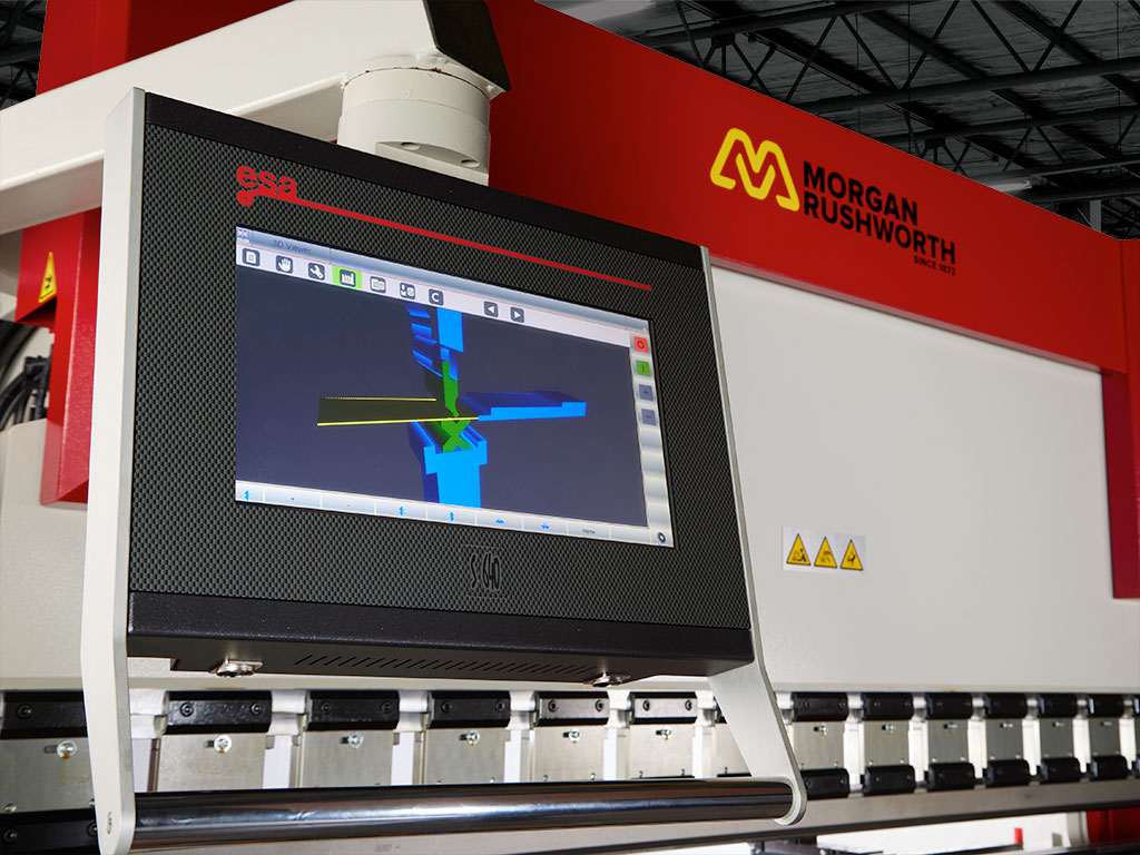The Morgan Rushworth PBSL CNC press brakes are fitted with the ESA S 640 CNC control featuring a 15” touch screen and both numerical and 2D graphical program entry. Bending can also be graphically visualised in 2D showing the machine frame, top and bottom tools, back gauge fingers and part orientation. PC based software is included and, with the control networked, can be used to load programs from the office. The PBSL CNC models feature 3-axis CNC control of the left and right ram cylinders and the back gauge depth. The position of the two cylinders is fully synchronised with high precision scales on the side frames ensuring ram parallelism. AKAS laser tooling guards are standard and offer a vastly improved operator experience without compromising safety. All PBSL CNC models are supplied with sectionalised euro style top tools and a multi vee bottom die and can be specified with a number of options including crowning systems and CNC controlled R axis.